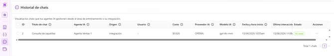Desde este espacio puedes revisar el detalle de cada interacción, identificar el agente que participó en la conversación, el modelo utilizado, el costo generado y el estado actual del chat.