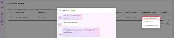 - Ver chat completo: Permite visualizar el contenido completo de la conversación en una ventana emergente. Desde esta vista puedes revisar el detalle de los mensajes intercambiados entre el usuario y el agente IA, incluyendo el orden cronológico y la hora de cada interacción.