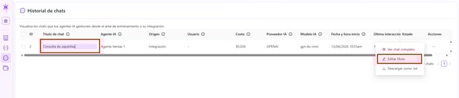 - Editar título: Permite modificar el nombre asignado al chat. Esta opción es útil para organizar mejor el historial de conversaciones o identificar rápidamente interacciones relevantes dentro del listado.