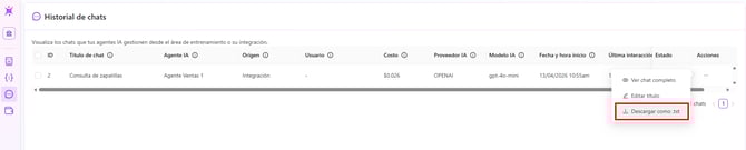 - Descargar como .txt: Permite exportar la conversación completa en formato de texto (.txt). Esta funcionalidad es útil para documentación interna, auditorías, análisis de interacciones o seguimiento de pruebas realizadas con agentes IA.
