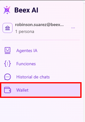El módulo Wallet permite gestionar el saldo disponible para el uso de los agentes IA dentro de la plataforma Beex AI. Desde este espacio puedes recargar crédito, consultar consumos generados por los agentes y monitorear el uso de recursos asociados a los modelos de inteligencia artificial.