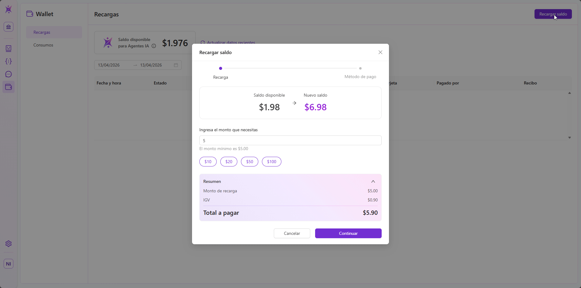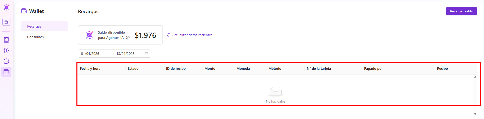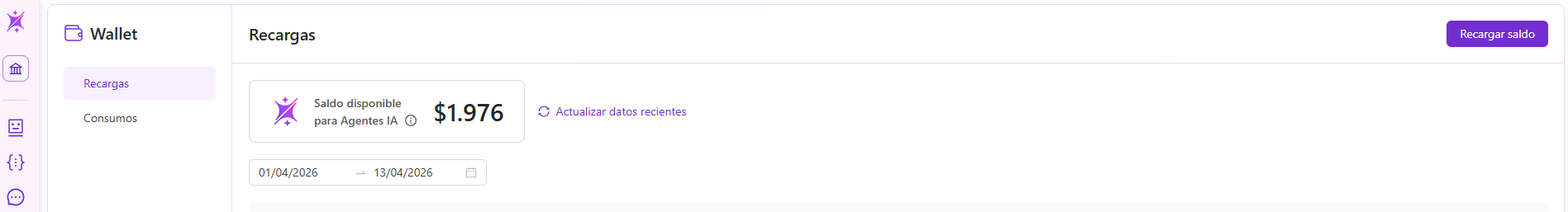 La sección Recargas permite visualizar el saldo disponible y registrar nuevas recargas para habilitar el funcionamiento continuo de los agentes IA.