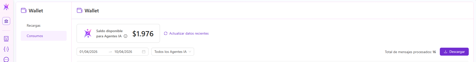 - Saldo disponible para Agentes IA: Muestra el monto actual restante disponible para el uso del sistema.