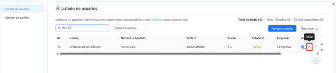 Dentro del listado de usuarios, ubica al usuario al que le realizarás el cambio de contraseña. En la columna de "Acciones", en la parte derecha, encontrarás la opción "Editar".