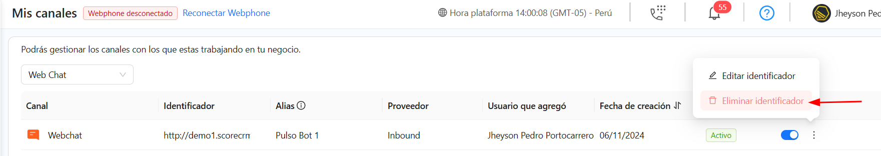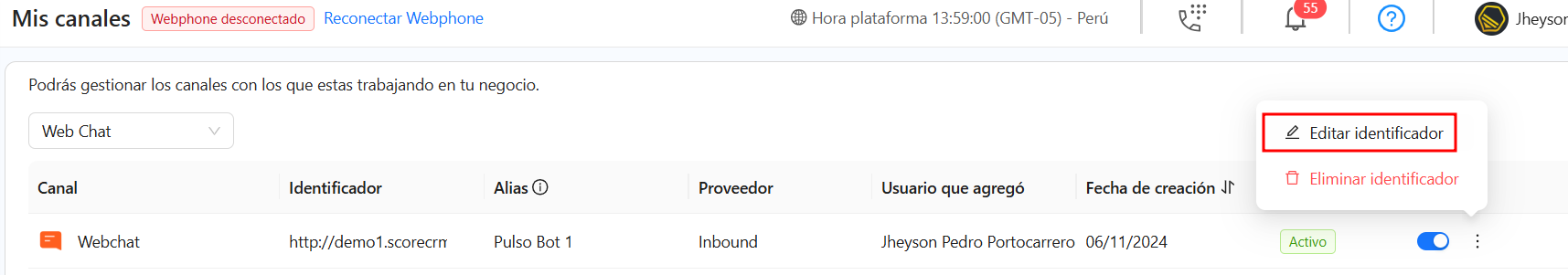 Una vez que tu Webchat está configurado e instalado, puedes gestionarlo fácilmente desde la sección “Mis canales”. Estas son las principales acciones disponibles: