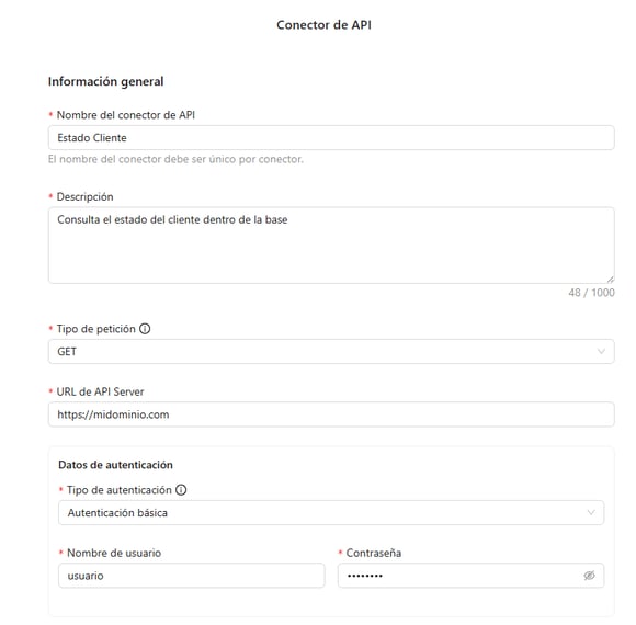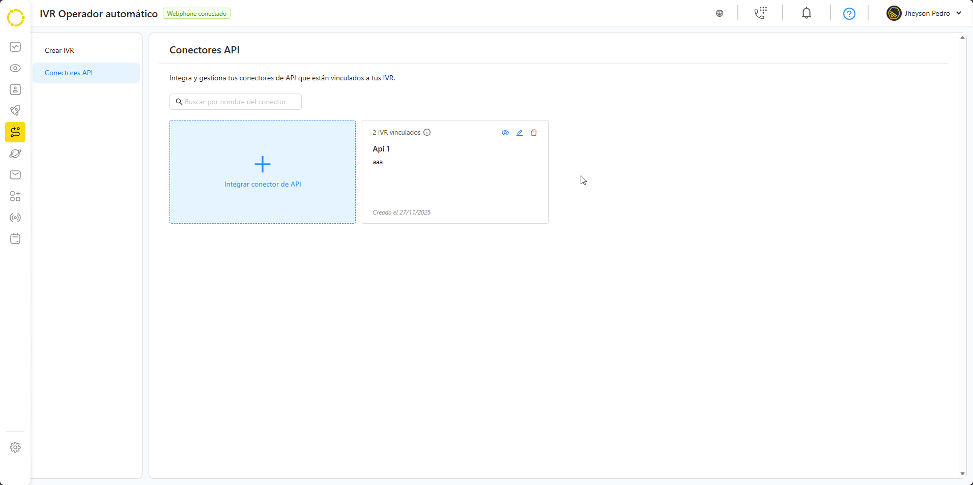 En este apartado puedes crear y gestionar múltiples conectores de API. Para cada conector, tendrás disponibles las siguientes acciones: