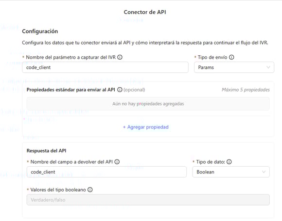 Esta sección permite integrar tu IVR con un servicio externo a través de una API. Con esto podrás enviar datos capturados por el IVR y recibir una respuesta que permitirá decidir hacia qué parte del flujo continuar.