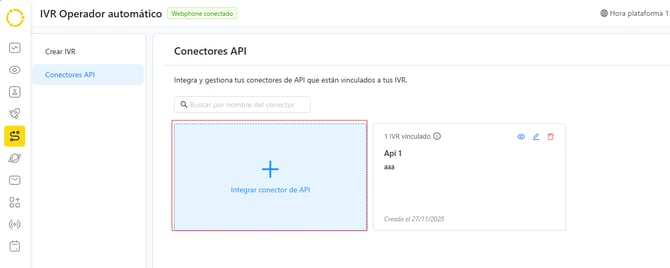 El Conector API permite integrar tu IVR con servicios externos enviando datos capturados del flujo y recibiendo respuestas que determinan la ruta a seguir.