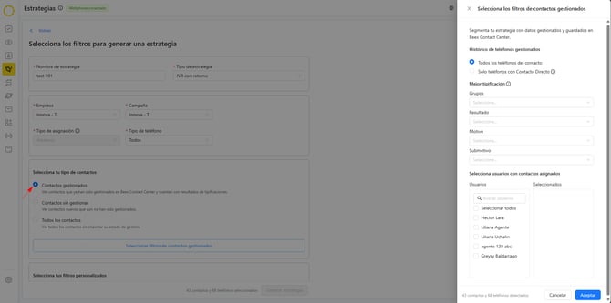 Permite asignar agentes o usuarios que participarán en la ejecución de la estrategia IVR con Retorno.