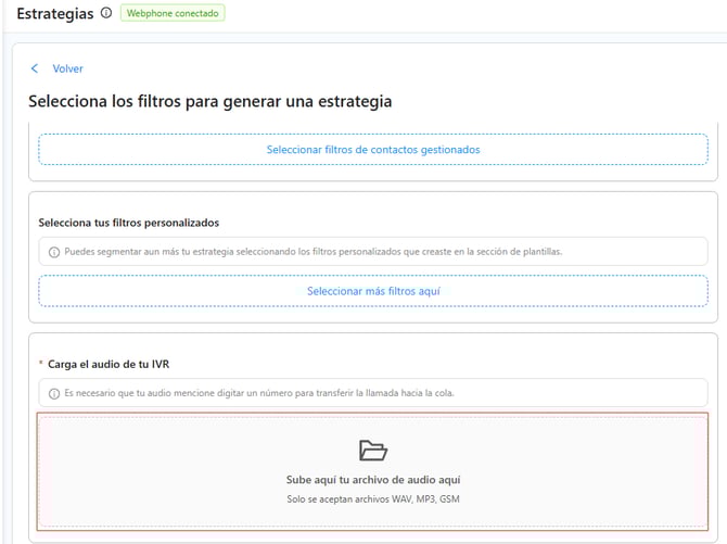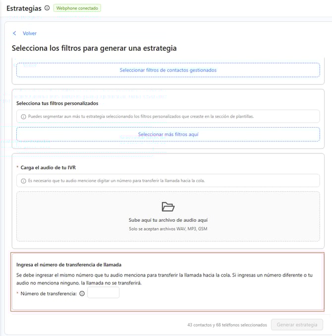 Incluye opciones para cargar el audio, definir el número de transferencia y segmentar contactos por filtros o plantilla.