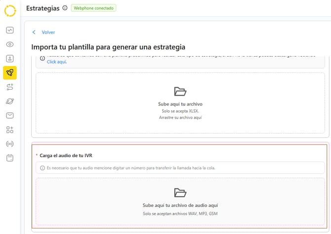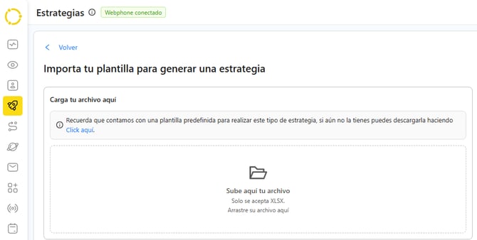 Además de los filtros internos, también puedes crear una estrategia IVR con Retorno cargando una plantilla de contactos en formato Excel (XLSX). Esta modalidad es ideal cuando deseas trabajar con un conjunto de contactos externo o previamente segmentado fuera de la plataforma.