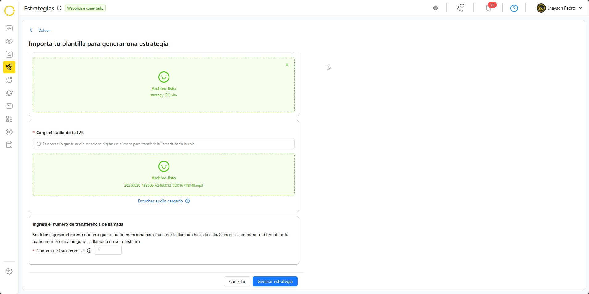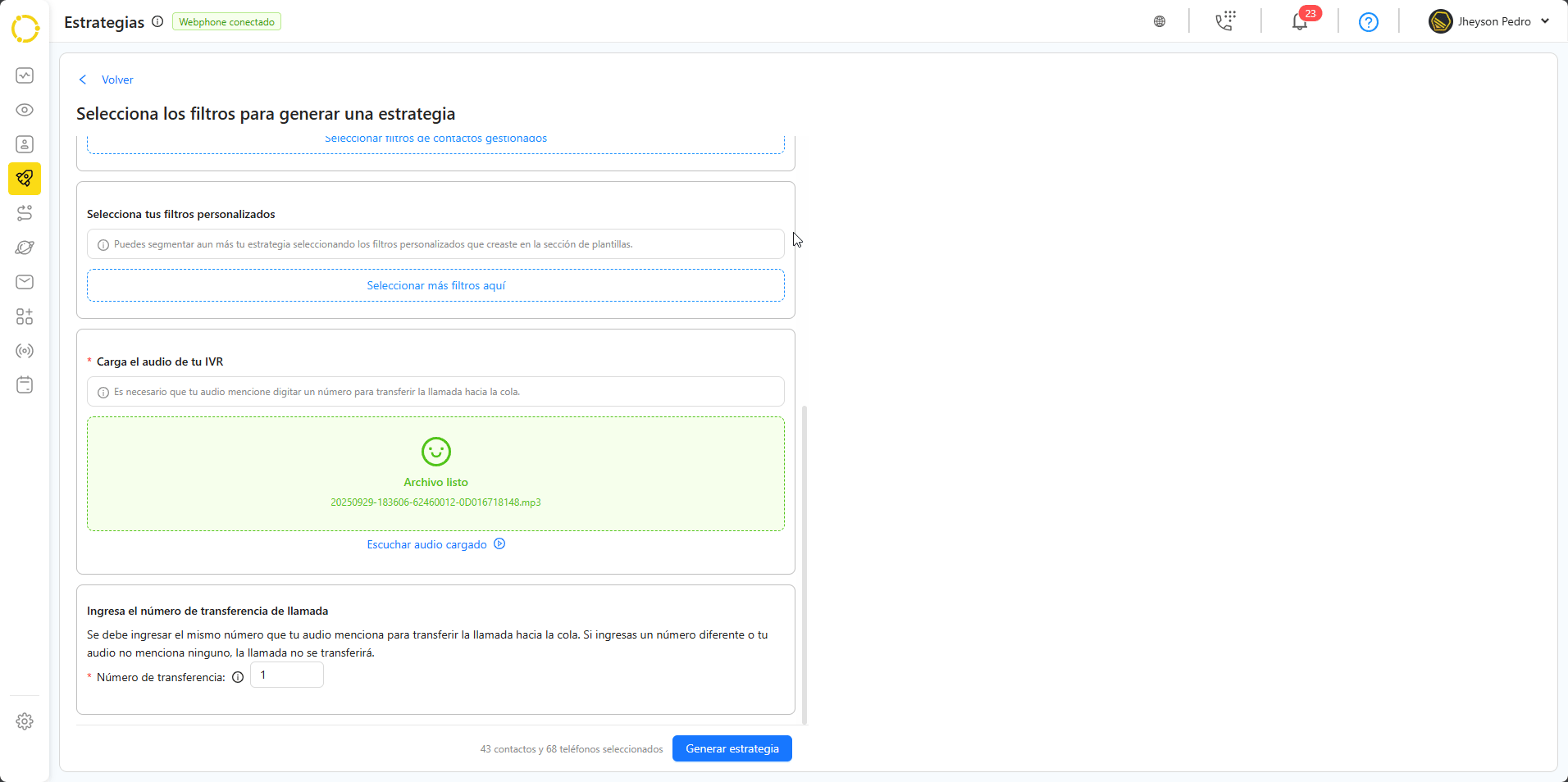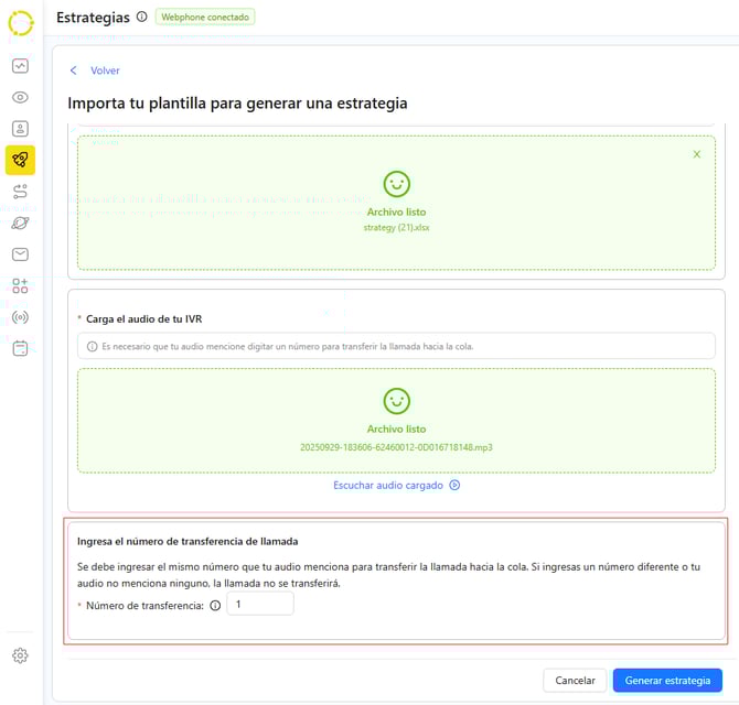 Nota: Si cambias el número en el audio o el texto del mensaje, recuerda actualizar también el valor del campo “Número de transferencia” antes de generar la estrategia.