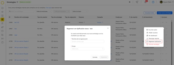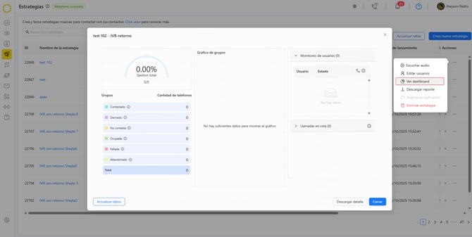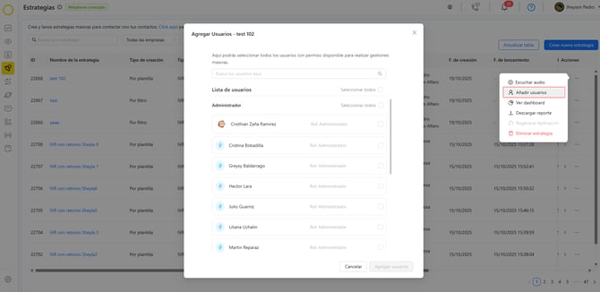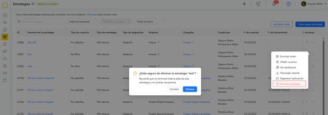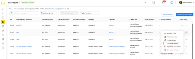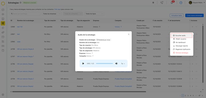 Desde el listado puedes escuchar el audio, añadir usuarios, ver resultados, descargar reportes y eliminar la estrategia.