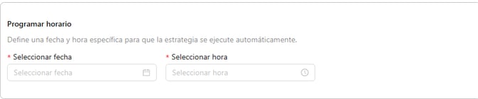 - Horario de inicio: Define el lanzamiento de la estrategia si será manual o programada