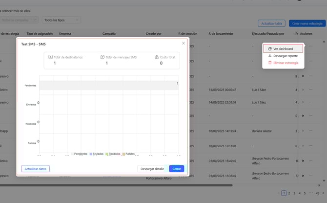 Una vez creada, se pueden gestionar acciones como ver el dashboard, descargar reportes o eliminar la estrategia.