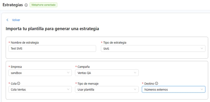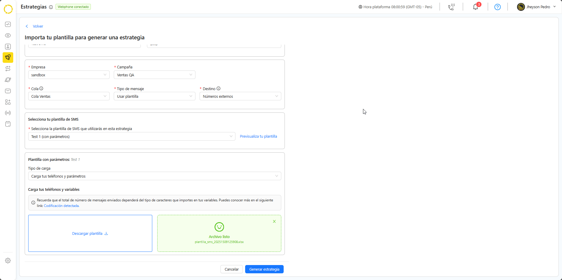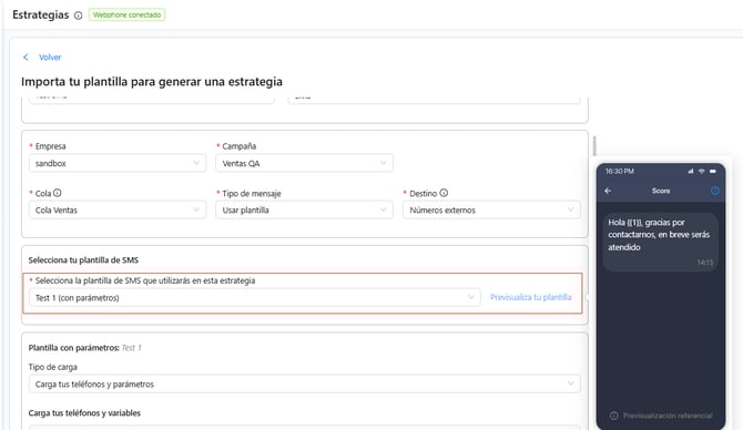 La estrategia SMS permite enviar mensajes masivos o dirigidos a contactos registrados o a números externos.