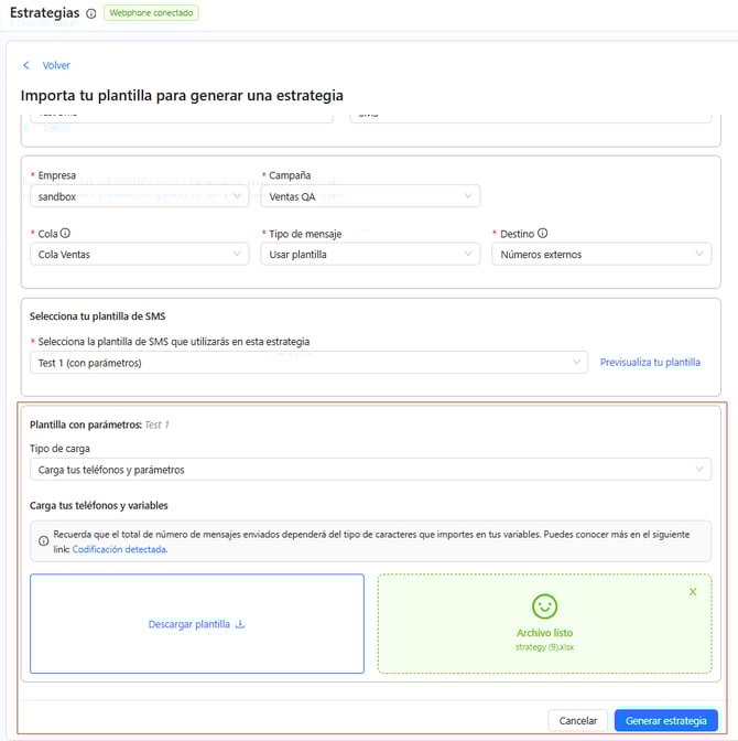 Completar archivo: incluye los números de teléfono y, si aplica, variables personalizadas que reemplazarán parámetros en el mensaje (ejemplo: nombre del contacto).