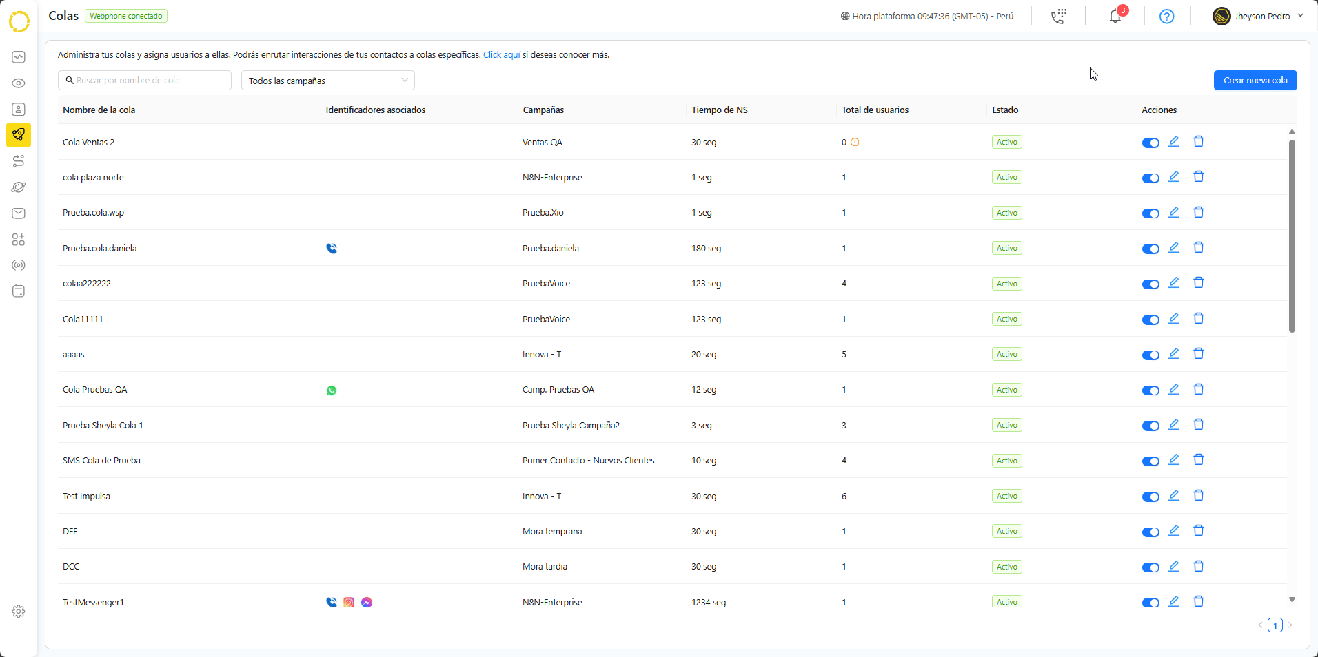 El módulo de Colas permite centralizar y distribuir tickets entrantes de mensajería y telefonía. Desde aquí puedes crear nuevas colas, asignar usuarios y configurar parámetros como nivel de servicio, canales y reglas de reparto. Además, ofrece acciones rápidas para activar, editar o eliminar colas según las necesidades de la campaña. Su uso garantiza una atención organizada, eficiente y orientada al equipo correcto.