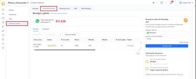 Asegúrate de estar en la pestaña WhatsApp Message, donde verás el detalle de tu saldo actual y consumo.