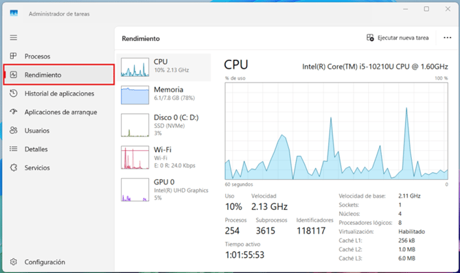 - Observa el uso en tiempo real de CPU, RAM, Disco, GPU y Red.