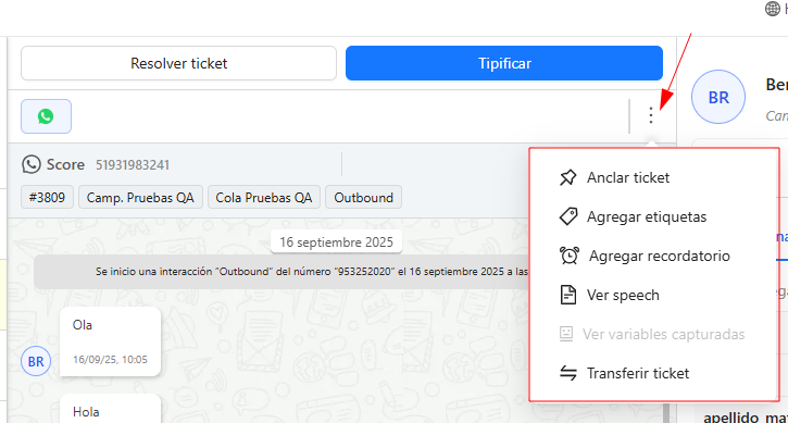 En la segunda columna del ticket, haz clic en los tres puntos bajo el botón "Tipificar" para acceder a varias opciones: