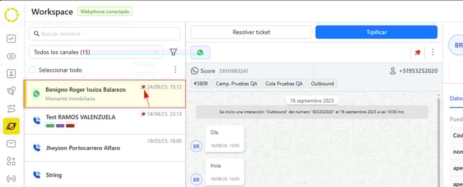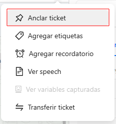 La función Anclar ticket permite fijar un ticket en la parte superior de la bandeja de conversaciones dentro de Workspace.